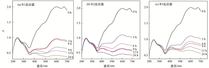 NB染料濃度為400 mg ·L-1,在有外加碳源條件下,染料在R1、R2、R3反應(yīng)器中24 h生物降解過程全波段紫外光譜如圖 7所示.