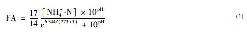 NH4+-N:納氏試劑比色法;NO2--N:N-(1-萘基)-乙二胺光度法;NO3--N:紫外分光光度法;pH值:pHTestr30型pH計;溶解氧:Multi350i型溶解氧儀;TN按下式計算:TN=(NH4+-N)+(NO2--N)+(NO3--N);溫度:水銀溫度計;FA通過式 (1)計算;亞硝酸化率 (nitrite accumulation rate, NAR) 通過式 (2)計算.
