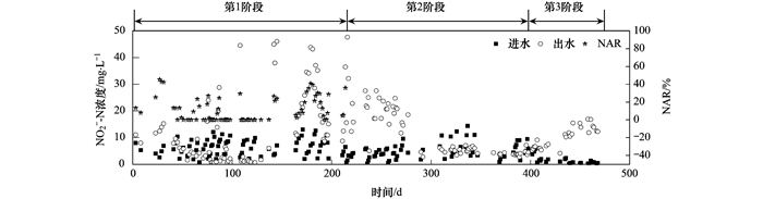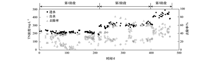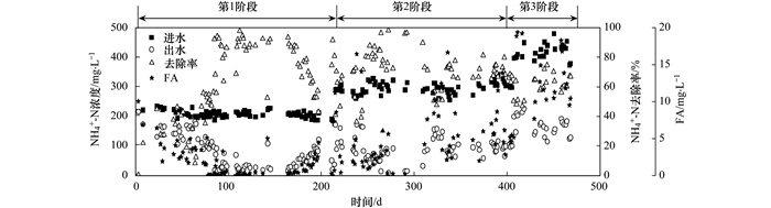 根據進水NH4+-N濃度將試驗過程分為3個階段:第1階段 (1~214 d),進水NH4+-N濃度在200 mg ·L-1左右;第2階段 (215~406 d),進水NH4+-N濃度在300 mg ·L-1左右;第3階段 (407~468 d),進水NH4+-N濃度在400 mg ·L-1左右.