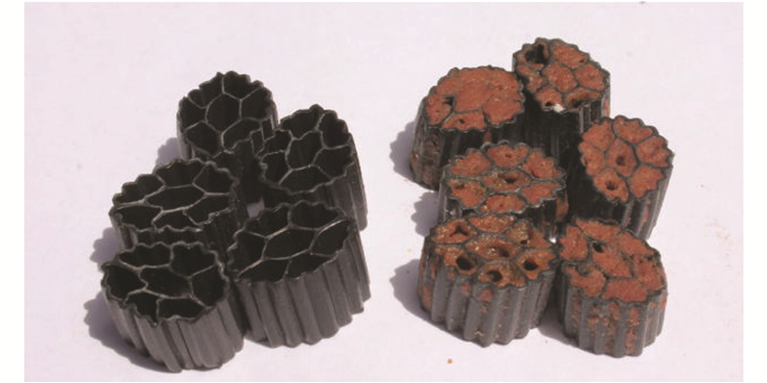 進一步提高進水NH4+-N濃度在400mg ·L-1后,由圖 3和圖 6可以看出,這一階段提高NH4+-N濃度后反應器變化和第二階段明顯不同,第二階段改變進水NH4+-N濃度后,NH4+-N和TN去除率都出現較大波動,經過短期的適應恢復并有所提高.但是此次改變卻沒有引起較大波動,這是由于此時達到較多生物量,如圖 7所示,填料內部已經充滿了紅色的生物膜,這是ANAMMOX的典型特征之一.