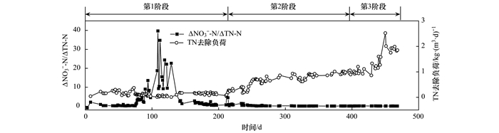 第1階段,在ΔNO3--N/ΔTN相對較低,但其中的TN損失主要源于硝化反硝化,且此值在前80 d平均為1.03,依然遠大于0.127,短程硝化并不穩(wěn)定.此后,短程硝化更加不穩(wěn)定,在109 d時,ΔNO3--N/ΔTN高達39.68,短程硝化完全失效,此后,此值開始逐漸下降;第2階段,在215 d,ΔNO3--N/ΔTN為0.93,此后,該值在波動中繼續(xù)下降,至405 d,該值進一步降低至0.11,低于0.127,顯示此時,短程硝化已經趨于穩(wěn)定;至第3階段,ΔNO3--N/ΔTN比值在0.10左右,顯示反應器中的短程硝化在這個過程中非常穩(wěn)定.
