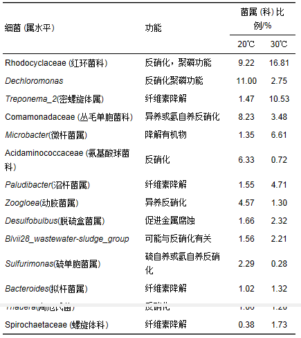 可見,溫度從20℃升高到30℃時(shí),反硝化細(xì)菌所占已知微生物菌屬的比例降低,纖維素類降解菌所占的比例增加,表明降解纖維素類細(xì)菌隨溫度升高比反硝化細(xì)菌增長(zhǎng)更快,受溫度影響更大.