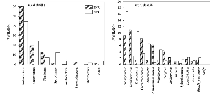 從圖 6(a)可知,樣品分類后共得到6種已知菌門,Proteobacteria (變形菌門) 在20℃和30℃條件下均為比例最大的菌門,其相對(duì)豐度分別為60%和44.72%,變形菌門中大部分微生物趨向于在厭氧環(huán)境下通過(guò)分解有機(jī)物進(jìn)行反硝化脫氮過(guò)程;Bacteroidetes (擬桿菌門) 中大多數(shù)細(xì)菌可以將纖維素降解成可溶性糖類,其相對(duì)豐度分別為19.46%和24.53%;Firmicute (厚壁菌門) 中大多數(shù)細(xì)菌可以參與污泥反硝化脫氮過(guò)程,其相對(duì)豐度分別為13.29%和7.31%;Acidobacteria (酸桿菌門) 相對(duì)豐度分別為0.31%和3.85%,這類細(xì)菌可以將纖維素、半纖維素降解成可溶性糖類和有機(jī)酸;Spirochaetae (螺旋菌門) 是一類可以專一降解半纖維素的細(xì)菌,其相對(duì)豐度分別為1.88%和12.84%;Fibrobacteres (纖維桿菌門) 細(xì)菌細(xì)胞周質(zhì)中含有纖維素酶可以分解纖維素,其相對(duì)豐度分別為0.56%和2.0%.數(shù)據(jù)表明,30℃條件下降解纖維素、半纖維素有關(guān)的菌屬占已知細(xì)菌菌屬的43.22%,比20℃時(shí)高出11.01%;30℃條件下與反硝化有關(guān)菌屬占已知細(xì)菌菌屬的52.03%,比20℃下降了21.26%.下文將從細(xì)菌屬水平更詳細(xì)地探討溫度對(duì)微生物種群特性的影響.