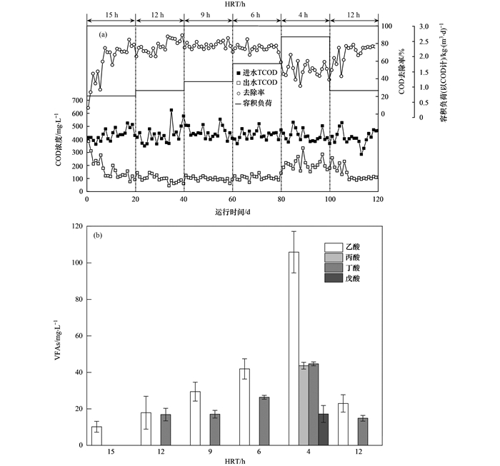 通過改變HRT,將SCAR的容積負(fù)荷分4個(gè)階段逐漸由0.7 kg·(m3·d)-1提升至0.89、1.18、1.77及2.7 kg·(m3·d)-1,對(duì)應(yīng)HRT分別為12、9、6和4 h.由圖 2(a)可見,在HRT分別為12、9和6 h時(shí),每次提高容積負(fù)荷后的1~3 d內(nèi),由于代謝底物量的增加和負(fù)荷改變對(duì)微生物空間相對(duì)位置的擾動(dòng),反應(yīng)器對(duì)污水COD去除效果變差,但隨著反應(yīng)器的運(yùn)行,微生物逐漸適應(yīng)了新的負(fù)荷條件,污水COD去除率逐漸回升.而隨著HRT的縮短,減少了代謝底物的生化反應(yīng)時(shí)間,反應(yīng)器對(duì)污水COD的平均去除率會(huì)有所降低,但下降幅度較小,反應(yīng)器對(duì)COD平均去除率基本可以維持在75%以上.隨著污水HRT降低至4 h,在此條件下運(yùn)行的20 d內(nèi),反應(yīng)器出水平均COD由107 mg·L-1提高到209 mg·L-1,COD去除率由75.3%降低到50.8%,而且出水中一直含有大量VFAs,這說明較短的HRT無法滿足厭氧酸化作用生成的有機(jī)酸類物質(zhì)進(jìn)行充分堿性發(fā)酵所需的反應(yīng)時(shí)間.隨后將HRT調(diào)至12 h,反應(yīng)器運(yùn)行狀況迅速好轉(zhuǎn),COD去除率很快回升到75%左右.由此可見,在保證代謝基質(zhì)充分生物降解時(shí)間條件下,SCAR反應(yīng)器對(duì)一定范圍內(nèi)變化的容積負(fù)荷具有良好的適應(yīng)能力;本實(shí)驗(yàn)條件下,HRT=6 h可以保證SCAR對(duì)生活污水具有良好的處理效率.