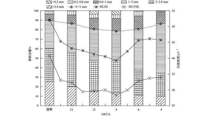 在接種的顆粒污泥中,φ>1 mm的顆粒污泥比例占90%,φ>2 mm的顆粒污泥比例占60%;在HRT=12 h運(yùn)行階段,φ>1 mm的比例降至80%,φ>2 mm的比例下降至47%;HRT=6 h時(shí),φ>1 mm的比例回升至81%,粒徑在1~2 mm間的顆粒污泥已經(jīng)由接種時(shí)的30%提高至44%;HRT=4 h時(shí),φ>1 mm的比例已經(jīng)提高至86%,其中φ1~2 mm的污泥已經(jīng)占了52%,而且φ < 1 mm的比例相比前一個(gè)周期也降低了5%.整個(gè)實(shí)驗(yàn)期間,顆粒污泥粒徑變化的基本趨勢是小顆粒 (φ < 1 mm) 與大顆粒污泥 (φ>2 mm) 逐漸減小,而中間粒徑污泥 (φ在1~2 mm之間) 的量逐漸增多.反應(yīng)器運(yùn)行前期接種泥粒徑較大,低濃度的生活污水提供的營養(yǎng)不足,大顆粒污泥因?yàn)榈貌坏匠浞执x底物容易在內(nèi)部形成空腔,進(jìn)而破碎形成較小粒徑污泥;營養(yǎng)物質(zhì)進(jìn)入小粒徑顆粒污泥時(shí)阻力相對(duì)較小,小顆粒污泥容易成長,而更加細(xì)小污泥在較高上升流速 (Vup) 條件下也容易被洗出,這些綜合作用造成了中間粒徑顆粒污泥比例的增加.