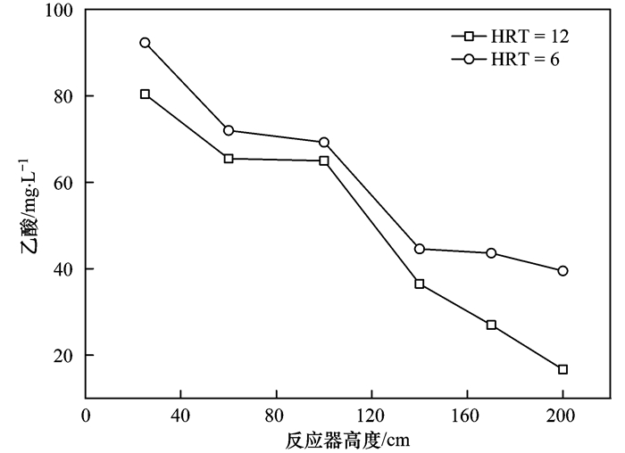 為了探究容積負(fù)荷對(duì)反應(yīng)器中微生物群落分布的影響,分別對(duì)反應(yīng)器接種污泥HRT=12 h及HRT=6 h條件下反應(yīng)器的主體反應(yīng)區(qū)和精細(xì)反應(yīng)區(qū)污泥樣本進(jìn)行高通量測序分析,結(jié)果如圖 6、圖 7;圖 8為HRT=12 h和HRT=6 h條件下,反應(yīng)器不同高度處的乙酸濃度.