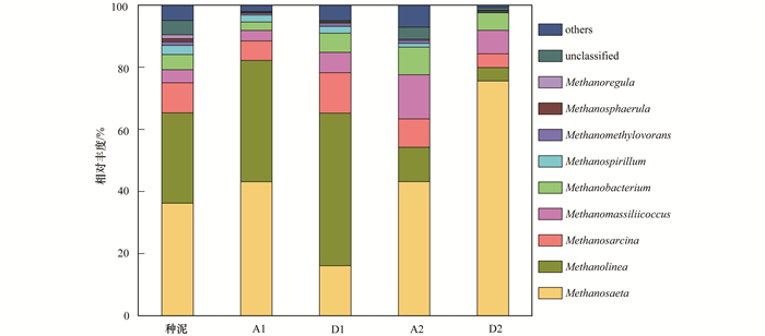反應(yīng)器接種污泥中古菌的優(yōu)勢菌分布較廣,在古菌的屬水平分布中,主要有甲烷鬢菌屬 (Methanosaeta sp.,相對(duì)豐度為36.2%)、甲烷繩菌屬 (Methanolinea sp., 相對(duì)豐度為29.1%)、甲烷八疊球菌屬 (Methanosarcina sp.,相對(duì)豐度為9.7%)、第七產(chǎn)甲烷古菌屬 (Methanomassiliicoccus,相對(duì)豐度為4.2%)、甲烷桿菌屬 (Methanobacterium,相對(duì)豐度為4.9%) 以及其它一些菌屬.實(shí)驗(yàn)期間,甲烷鬢菌屬 (Methanosaeta sp.) 和甲烷繩菌屬 (Methanolinea sp.) 一直為主要優(yōu)勢菌種,二者相對(duì)豐度之和大于50%,甚至超過80%. Chelliapan等的研究也顯示厭氧反應(yīng)器的容積負(fù)荷范圍為0.86~1.86 kg·(m3·d)-1時(shí)甲烷鬢菌是反應(yīng)器運(yùn)行過程中的主導(dǎo)微生物.甲烷鬢菌 (Methanosaeta) 是一種典型的乙酸營養(yǎng)型細(xì)菌,對(duì)厭氧反應(yīng)器的穩(wěn)定運(yùn)行起著重要作用.當(dāng)HRT=12 h,進(jìn)水容積負(fù)荷較低,營養(yǎng)不足,反應(yīng)器上部乙酸含量較少,甲烷鬢菌屬 (Methanosaeta) 很難利用到乙酸底物,相對(duì)豐度降至16.08%,優(yōu)勢逐漸減弱,當(dāng)HRT=6 h,容積負(fù)荷提高,反應(yīng)器上部的乙酸含量明顯增加,甲烷鬢菌屬 (Methanosaeta) 又恢復(fù)成為絕對(duì)的優(yōu)勢菌種 (相對(duì)豐度為75.58%). Siggins等研究EGSB反應(yīng)器處理三氯乙烯廢水發(fā)現(xiàn),VFA (主要是乙酸) 出現(xiàn)積累時(shí)甲烷鬢菌 (Methanosaeta) 是主導(dǎo)微生物.在圖 8中,兩種負(fù)荷條件下SCAR反應(yīng)器主體反應(yīng)區(qū)的乙酸含量均較高 (均超過80 mg·L-1),主體反應(yīng)區(qū)內(nèi)甲烷鬢菌屬 (Methanosaeta) 相對(duì)豐度在兩種負(fù)荷條件下幾乎相同,而精細(xì)反應(yīng)區(qū)的乙酸含量差別較大,在2 m高度處、HRT=12 h條件下乙酸僅為約15 mg·L-1,而HRT=6 h條件下乙酸濃度約為40 mg·L-1,對(duì)應(yīng)著后者條件下精細(xì)反應(yīng)區(qū)內(nèi)甲烷鬢菌屬 (Methanosaeta) 相對(duì)豐度遠(yuǎn)高于前者,由此可見,當(dāng)乙酸濃度小于某一濃度時(shí) (本實(shí)驗(yàn)為15 mg·L-1),甲烷鬢菌屬 (Methanosaeta) 相對(duì)豐度會(huì)產(chǎn)生巨大變化. Wang等[35]研究EGSB處理養(yǎng)豬廢水時(shí)容積負(fù)荷提高到10 kg·(m3·d)-1,乙酸營養(yǎng)型產(chǎn)甲烷菌才能轉(zhuǎn)化成氫營養(yǎng)型產(chǎn)甲烷菌.但本研究中,甲烷繩菌屬 (Methanolinea) 屬于氫營養(yǎng)型產(chǎn)甲烷菌,較低負(fù)荷條件下反應(yīng)器產(chǎn)生的乙酸量較少,乙酸營養(yǎng)型產(chǎn)甲烷鬢菌 (Methanosaeta) 很難占據(jù)主導(dǎo)地位,氫營養(yǎng)型甲烷繩菌優(yōu)勢地位明顯.