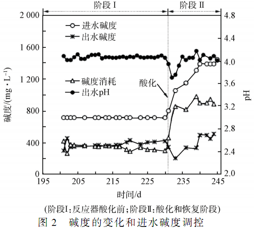 酸化后,為維持出水 pH 在 4. 2 ~ 4. 5 范圍內(nèi),在不改變其他運(yùn)行參數(shù)的情況下,從 231 d 開(kāi)始,NaHCO3 的日投加量從 45 g 升至 50 g,并逐漸增加,當(dāng)升至 90 g 時(shí)(第 240 天) ,系統(tǒng)出水 pH 穩(wěn)定在4. 2 ~ 4. 5 范圍內(nèi)。 進(jìn)水堿度隨 NaHCO3 的增加而增加,最終維持在 1 385 mg·L - 1左右才可保障出水的pH 維持在 4. 2 以上。 酸化后,堿度的消耗量逐漸增加,最終穩(wěn)定在 900 mg·L - 1左右。 酸化導(dǎo)致系統(tǒng)堿度消耗量的增加的原因可能是:一方面,酸化使系統(tǒng)緩沖能力的穩(wěn)定性遭到破壞,并且 pH 大幅度下降,酸化后需要外界長(zhǎng)期提供較高的堿度以恢復(fù)系統(tǒng)的緩沖能力,并提高系統(tǒng)的 pH 值;另一方面,在酸化前,系統(tǒng)能同時(shí)產(chǎn)生氫氣和甲烷,產(chǎn)甲烷過(guò)程會(huì)為系統(tǒng)內(nèi)部提供部分堿度,酸化后產(chǎn)甲烷活性受到抑制,酸化前產(chǎn)甲烷過(guò)程產(chǎn)生的部分堿度需由外界提供,所以堿度消耗量增加。 在酸化階段,出水堿度迅速下降,隨著進(jìn)水堿度的增加,出水堿度逐漸恢復(fù),最終穩(wěn)定在 500 mg·L - 1左右。 在實(shí)際運(yùn)行過(guò)程中,當(dāng)系統(tǒng)堿度消耗量有明顯上升時(shí),應(yīng)立即增加進(jìn)水中堿的投加量以提高進(jìn)水堿度,從而避免系統(tǒng)受到酸化沖擊。