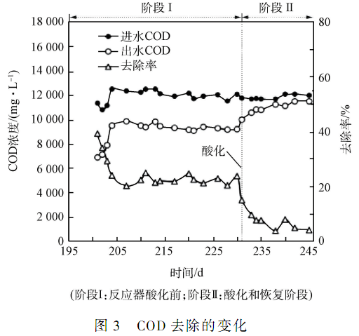 如圖 3 所示,進(jìn)水 COD 濃度上升至 12 000 mg·L - 1時(shí)(從第 201 天開(kāi)始) ,容積負(fù)荷也增加至 58. 8kg·(m3·d) - 1,出水 COD 逐漸升高至 9 000 mg·L - 1左右,COD 去除率也逐漸下降至20% ~ 25%的范圍內(nèi)。 在第 231 天,系統(tǒng)發(fā)生酸化時(shí),COD 去除率急劇下降,最終維持在 4%左右。 雖然后續(xù)采取了相應(yīng)補(bǔ)救措施,可使出水 pH 恢復(fù)至 4. 0 以上,但 COD 去除率仍然很難恢復(fù)。