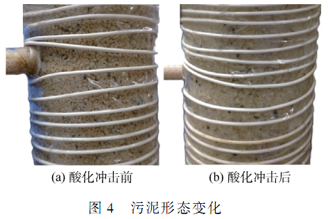 在酸化前,系統(tǒng)中污泥為乳白色顆粒污泥(圖 4( a) ) ;酸化后,污泥逐漸解體為絮狀污泥(圖 4( b) ) ,并伴有污泥上浮隨出水流出,導(dǎo)致厭氧顆粒污泥發(fā)酵系統(tǒng)崩潰。