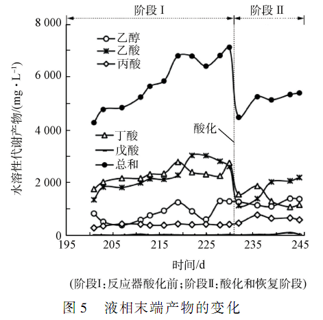 酸化之前,系統(tǒng)液相末端產(chǎn)物總量有上升趨勢(shì);酸化之后,系統(tǒng)液相末端產(chǎn)物急劇下降,這是因?yàn)檫^(guò)酸化階段較低的 pH 對(duì)反應(yīng)器內(nèi)微生物活性有抑制作用,所以酸化后代謝產(chǎn)物相應(yīng)地減少。 另外,酸化將系統(tǒng)的發(fā)酵類型從丁酸型轉(zhuǎn)化為混合酸發(fā)酵類型,其產(chǎn)氫能力低于丁酸型發(fā)酵的產(chǎn)氫能力;另一方面,混合酸發(fā)酵會(huì)使系統(tǒng)中丙酸濃度增加,不利于產(chǎn)甲烷階段的進(jìn)行和有機(jī)物的去除。 由此可見(jiàn),酸化不利于系統(tǒng)維持相對(duì)高效的發(fā)酵類型。