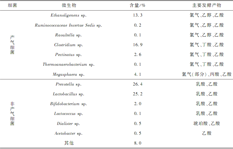 3)酸化會(huì)導(dǎo)致低 pH 值厭氧發(fā)酵系統(tǒng)的微生物種群發(fā)生變化,非產(chǎn)氫發(fā)酵細(xì)菌為優(yōu)勢(shì)細(xì)菌(54. 7% ) ,而產(chǎn)氫細(xì)菌所占比例較少(37. 3% ) ,未檢測(cè)到產(chǎn)甲烷細(xì)菌存在。