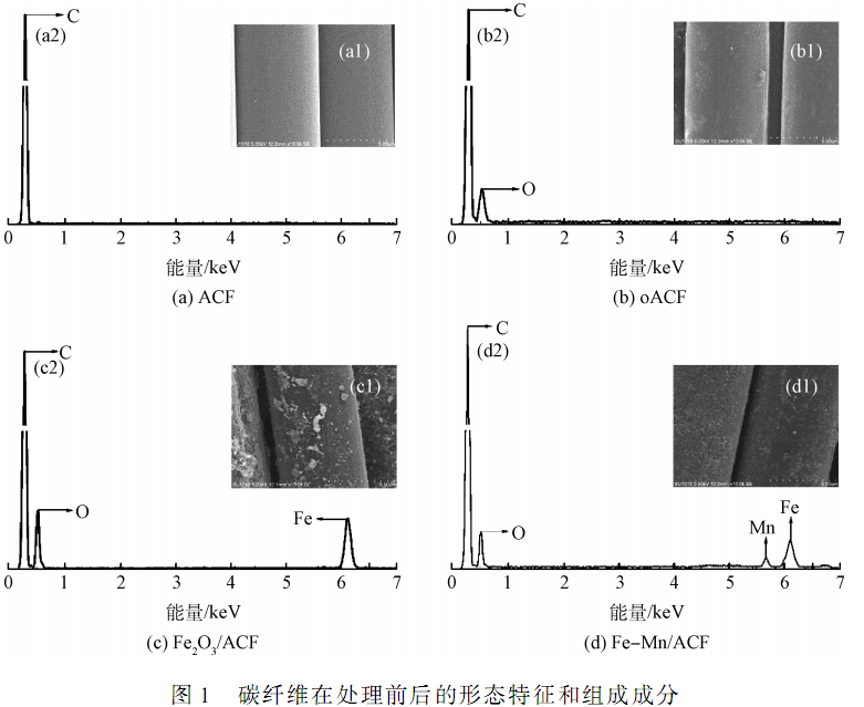為了觀察樣品的微觀形態(tài)與組成成分,通過掃描電子顯微鏡( SEM)與能譜分析( EDS)對(duì)其進(jìn)行了觀察測(cè)試,結(jié)果如圖 1 所示。 圖 1( a)是未經(jīng)氧化的碳纖維表面的電鏡圖和能譜分析圖。 可以看出,未氧化的碳纖維表面很平滑,組成成分基本上都是 C 元素。 而經(jīng)過氧化的碳纖維( oACF)如圖 1( b)所示,硝酸處理之后的碳纖維表面被腐蝕,表面粗糙程度增大,且由圖1( b)中可以看出,經(jīng)過氧化后除了 C 峰以外還有O 峰,說明碳纖維表面成分發(fā)生了變化,在其表面形成了含氧官能團(tuán)。 通常,碳纖維經(jīng)氧化后發(fā)生的變化有助于與復(fù)合材料形成較強(qiáng)的分子間作用力,而且粗糙度的增加可以增大表面接觸面積,以便與復(fù)合材料形成較強(qiáng)的鍵合力。 圖 1( c)和( d)分別為負(fù)載有鐵化合物( Fe2O3 / ACF)和鐵錳化合物的碳纖維( Fe-Mn /ACF) 。 由圖 1( c)中的( c1)和圖 1( d)中的( d1)可以明顯看出,在碳纖維表面負(fù)載有其他物質(zhì),圖 1( c)中的( c2)和圖 1( d)中的( d2)則證明了負(fù)載的物質(zhì)分別為鐵化合物和鐵錳化合物,其中的鐵化合物已被本課題組證實(shí)為 Fe2O3 。 不同的是,圖 1( c)中的( c1)負(fù)載的 Fe2O3 顆粒大小不一,分散不均勻,存在團(tuán)聚現(xiàn)象;而由圖1( d)中的( d1)可知,少量錳化合物的摻入可以抑制 Fe2O3 顆粒粒徑的增長,從而使得碳纖維表面的負(fù)載物顆粒粒徑變小,分散更均勻。 碳纖維表面負(fù)載物顆粒粒徑越小,相對(duì)應(yīng)的比表面積則越大,進(jìn)而可以增加碳纖維表面的活性點(diǎn)位和提高電極的活性。 同時(shí),錳離子的加入也可以和 H2O2 發(fā)生類芬頓反應(yīng)產(chǎn)生·OH。