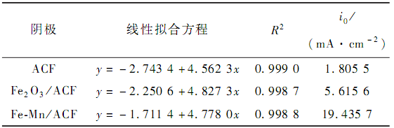 Tafel 曲線可以用來評(píng)價(jià)樣品的氧化還原反應(yīng)的催化活性,通過 Tafel 曲線圖的線性區(qū)域可以得到交換電流密度( i0 ) ,通常可用其來作為評(píng)價(jià)電極的電子轉(zhuǎn)移系數(shù)的重要指標(biāo)。 在經(jīng)過急劇上升之后,Tafel回歸曲線存在的過電勢(shì)區(qū)間在 80 ~ 100 mV。 圖 3 為不同陰極的 Tafel 曲線圖,表 1 為不同電極在線性區(qū)域內(nèi)的擬合結(jié)果。 由圖 3 可知,空白電極、Fe2O3 / ACF 電極與 Fe-Mn / ACF 電極在線性區(qū)域內(nèi)的截距在逐漸增大,分別為 - 2. 743 4、 - 2. 250 6 和 - 1. 711 4。 通過表1 可以得出空白電極、Fe2O3 / ACF 電極與 Fe-Mn / ACF 電極相對(duì)應(yīng)的 i0 分別為 1. 805 5、5. 615 6 和 19. 435 7 mA·cm - 2。 其中,Fe-Mn / ACF 電極的 i0 最高,分別是其他 2 個(gè)電極的 10. 8 倍和 3. 5 倍。 以上數(shù)據(jù)表明適量錳的加入可以加快氧化還原反應(yīng),提高陰極的催化活性。 該結(jié)論進(jìn)一步證實(shí), Fe-Mn / ACF復(fù)合電極的催化性能最好。