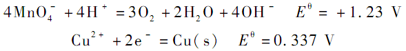 本實驗通過 KMnO4 陰極的 MFC 與 Cu2 +濃度為 10 mg·L - 1陰極 MFC 串聯(lián),用前者所產生的電壓對后者進行電壓補充,在較低 Cu2 +濃度下保證去除效率、加快回收速度的同時獲得額外功率輸出。 MnO -4 因其標準還原電位較高更適合做電子受體。 電化學反應標準還原電位(NHE,25 ℃,pH = 7)如下: