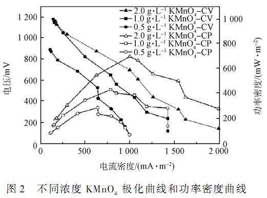 對照實驗中, 還分別對比了 KMnO4 濃度為1 mg·L - 1、 2 mg·L - 1時 Cu2 +的去除效率,雖然KMnO4濃度的提高可帶來較高的功率輸出,但其對Cu-MFC 的加速作用并不明顯,同樣與上文中提到的勒夏特列原理即 Cu2 +對電子接納能力有關。具體參見污水寶商城資料或http://wlmqsb.com更多相關技術文檔。