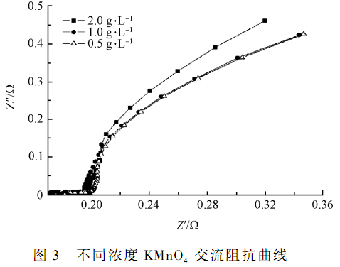 使用軟件得到圖 3 中的阻抗實部與橫軸的交點阻抗虛部即為歐姆 Rint,包括電解液之間的內阻,電極材料固有的內阻,電極材料和電流收集器之間的接觸內阻。 而曲線中半圓形的大小代表了電極和電解液界面上電子轉移能力的難易,稱其為電子轉移內阻,同時也代表了電極上電化學反應的阻力大小。值越小,說明電極和電解液之間的電子轉移速率越快。 KMnO4 濃度為 0. 5 g·L - 1時,Rint為476 Ω;KMnO4 濃度為 1 g·L - 1時,Rint為 421 Ω;KMnO4 濃度為2 g·L - 1時,Rint為359 Ω;說明隨著 KMnO4 濃度的增加,電池內阻逐漸減小,電子在電解液和電極之間的轉移速率增大。