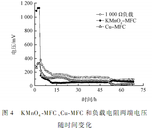 起初電壓下降較快的原因是 KMnO4 -MFC 不能較好的適應 pH 的快速升高和電導率的下降,該種現(xiàn)象可通過在 KMnO4 -MFC 加入緩沖液來彌補,即便在KMnO4 -MFC 電壓不足的情況下,Cu2 +的去除效率仍能達到 90%以上。