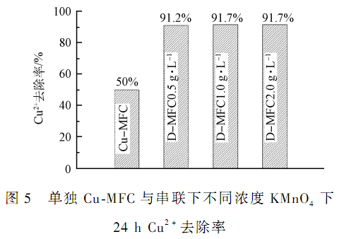 圖5 顯示了4 種連接方式下24 h 對 Cu2 +的處理效率,分別為單獨 Cu-MFC、串聯(lián) KMnO4 -MFC 與 Cu-MFC(KMnO4 濃度分別為 0. 5、1. 0、2. 0 g·L - 1) 。 可以看出 4 種連接方式下 24 h 去除效率分別為 50% 、91. 2% 、91. 7% 、91. 7% ,不難看出串聯(lián)條件下的24 hCu2 +去除效率比單獨 Cu-MFC 去除效率最高提高41. 7% 。 在串聯(lián)條件下,按照上文中 KMnO4 -MFC 電流電壓曲線的趨勢可知隨著 KMnO4 濃度的增加KMnO4 -MFC 提供給 Cu-MFC 的電壓和功率隨之增大,但陰極電解液中的 Cu2 +的去除速率提高并不明顯,KMnO4 濃度由 0. 5 g·L - 1提高至 1. 0 g·L - 1時去除效率僅提高 0. 5% ,提高至 2. 0 g·L - 1時處理效率未見明顯提高。 說明一味地提高電壓補給,并不能一直提高負載 Cu-MFC 的處理效率,可能與 Cu-MFC本身性能也有聯(lián)系,可通過勒夏特列原理解釋,即 Cu2 +的回收速率在前端電壓補給充足的情況下下取決于 Cu2 +本身接受電子的能力。