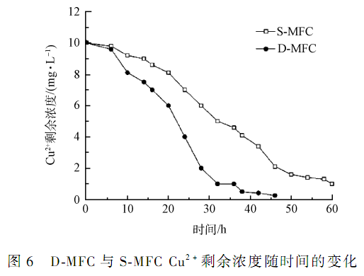 圖6 顯示 D-MFC 中 KMnO4 濃度為0. 5 mg·L -時,Cu-MFC 陰極室 Cu2 +的剩余濃度,可以看出,DMFC 中由于 KMnO4 -MFC 提供的電壓,其處理速率明顯高于 S-MFC,以處理效率達到 90% 為標準,D-MFC平均需要 30 h,而 S-MFC 則需要 60 h,實驗結果表明,該種連接方式可將 Cu2 +處理效率提高 50% 。