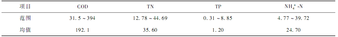中試裝置搭建于昆明第四污水廠內(nèi),進(jìn)水為經(jīng)污水廠三道格柵處理后的生活污水和污泥脫水原液,實驗期間進(jìn)水水質(zhì)見表 1。 實驗進(jìn)水水質(zhì)波動較大,其中 C / N(質(zhì)量比)為 5. 40,根據(jù)傳統(tǒng)脫氮理論,進(jìn)水碳源稍顯不足,屬于低 C / N 值生活污水,脫氮難度較大。