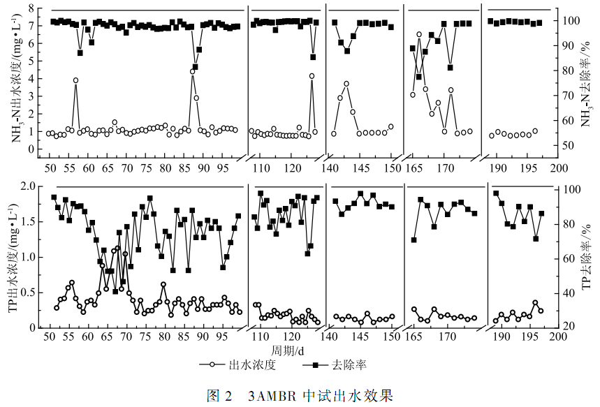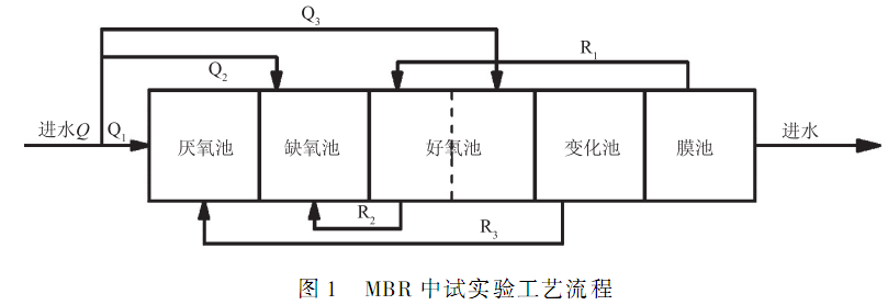 中試裝置的污泥齡為 15 d,膜池約為 7 g·L - 1,好氧池與變化池約為 6 g·L - 1,厭氧池與缺氧池約為5 g·L - 1。 總水力停留時間( hydraulic retention time,HRT)為 14. 04 h(其中:厭氧區(qū) 1. 08 h、缺氧區(qū) 7. 02h、好氧區(qū) 4. 32 h、膜區(qū) 1. 62 h) 。 該工藝設(shè)置了 3 個混合液回流:膜池至好氧池( R1 ) 、好氧池至缺氧池(R2 ) 、變化池至厭氧池(R3 ) 。 產(chǎn)水由自吸泵間歇抽吸出水,抽停時間比為 9 min / 1 min,每周進(jìn)行一次維護(hù)性清洗( enhanced flux maintenance,EFM) 。 進(jìn)水量、回流量與曝氣量主要通過電磁閥(2W- 250-25) 、液體電磁流量計(BTLD-20016 1110)與氣體流量計控制。