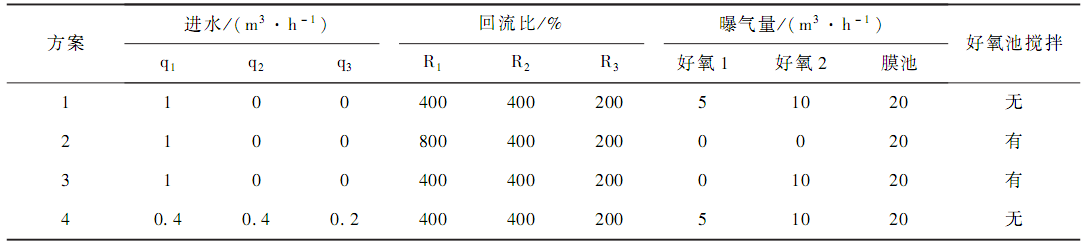 本研究優(yōu)選了 4 套實驗方案,其中方案 1 模擬昆明市第四污水處理廠處理工藝流程。 其他方案與方案 1 相比,主要調(diào)整如下:方案 2,完全停止好氧池曝氣,加大 R1 回流,主要考察膜池富余溶解氧利用替代曝氣的效果;方案 3,降低好氧池首段曝氣量,主要考察降低曝氣量的影響;方案 4,改變進(jìn)水方式,考察多點進(jìn)水運行工況的效果。 各方案運行的具體變量對比如表 2 所示。