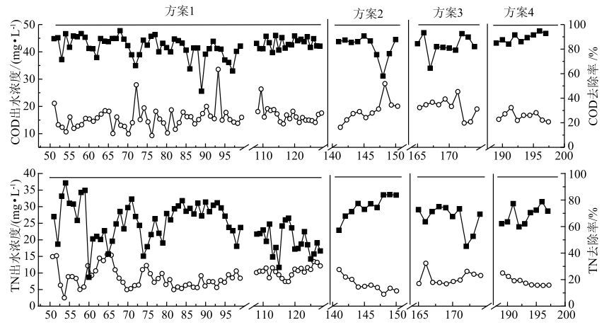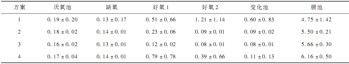 方案 3 降低曝氣量后,仍存在較高的 COD 和 NH3 -N 去除率,可能是存在兼型厭氧菌在低 DO 條件下利用有機(jī)碳源進(jìn)行反硝化作用。 但同時,NH3 -N 要高于方案 2 和方案 3,TN 去除率不高,這是因為反硝化菌活性不高,亞硝酸還原酶的合成受到抑制,導(dǎo)致反硝化過程中亞硝酸鹽的積累,這也在孫家君等、周丹丹等的研究中也發(fā)現(xiàn)相似的規(guī)律。