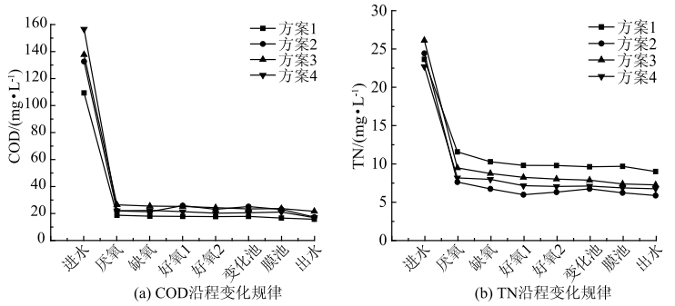 各方案在運行期間均達(dá)到了較好的 COD 去除效果,去除率分別為 86. 23% 、 87. 47% 、 84. 79% 、89. 65% 。 從沿程污染物濃度變化情況(圖 3)可知,由于受到生化降解及回流液稀釋的作用,各方案 COD濃度在厭氧池下降幅度較大,可達(dá)到 81. 28% 以上,后續(xù)處理單元對 COD 也有少量的去除作用。 改變運行參數(shù)后(方案 2、方案 3 及方案 4) ,各單元 COD 去除率均略有下降,但與對照組相比差異并不顯著,不影響出水達(dá)標(biāo)(均低于 30 mg·L - 1) 。 這表明,不同供氧方式及進(jìn)水方式對 COD 處理效果的影響不大。 當(dāng)改變供氧方式時(方案 2 或方案 3)好氧池溶解氧均值低于 0. 25 mg·L - 1,與厭氧池、缺氧池 DO 梯度變小, MBR 工藝中有機(jī)物的去除主要通過生化降解,而該套工藝中由于膜系統(tǒng)的存在具有極好的泥水分離效果,污泥濃度高(5 ~ 8 g·L - 1) ,保證了 COD 的良好去除率。 當(dāng)采用多點進(jìn)水時(方案 4) ,對碳源進(jìn)行了重新分配,但未見缺氧池與變化池 COD 值出現(xiàn)明顯上升,主要原因是污泥濃度較高,有機(jī)物在反應(yīng)器前段快速被消耗,而本次實驗的采樣點則位于處理構(gòu)筑物的末端。