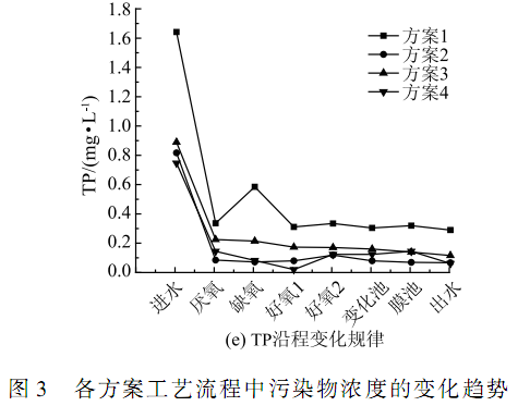 中試裝置除磷采用生物法 + 化學(xué)除磷,在昆明市第四污水處理廠超細(xì)格柵之后投加鐵鹽(硫酸鐵) ,由圖 3( c)可知,在厭氧池末端已實現(xiàn)了 TP 的有效去除,出水水質(zhì)均能達(dá)到 GB 18918-2002 一級 A 標(biāo)的要求。 由張嚴(yán)嚴(yán)等、李捷等與隋軍等前期在昆明第四污水處理廠所做研究可知,生物法 + 化學(xué)除磷法即使在 COD / TP < 20 時也可達(dá)到較好的除磷效果,且方法穩(wěn)定可靠。 本實驗中各方案除磷效果略有差別,主要是由于進(jìn)水水質(zhì)變化造成。