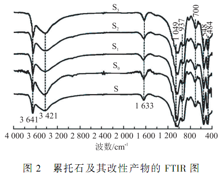 傅里葉紅外光譜用于分析樣品表面官能團(tuán)性質(zhì)。 圖 2 為累托石及其改性產(chǎn)物的 FTIR 圖。 累托石樣品在 3 641 cm - 1和 3 421 cm - 1處的吸收峰為羥基伸縮振動峰;1 633 cm - 1處的吸收峰是羥基的彎曲振動峰;在 1 049 cm - 1處的吸收峰為 Si—O—Si 骨架振動峰,937 cm - 1處的吸收峰是 Al—OH 伸縮振動峰,700、548 和 484 cm - 1處的吸收峰為 Si—O 彎曲振動峰。 由圖 2 可知,Fe2O3 /累托石的紅外光譜圖與累托石的相似,表明改性過程中累托石的硅酸鹽骨架基本未發(fā)生改變;與累托石和 Fe2O3 /累托石相比,未經(jīng)煅燒的 Fe2O3 /累托石樣品在 3 421 cm - 1處的吸收峰明顯增強(qiáng),這是因為未經(jīng)煅燒的 Fe2O3 /累托石樣品其層間有較多量的羥基鐵, 這些鐵羥基脫水需要吸收更多的熱量;經(jīng)煅燒處理羥基鐵脫水形成 Fe2O3 ,故 Fe2O3 /累托石在 3 421 cm - 1處的吸收峰明顯減弱。 這與 XRD 分析得到的結(jié)果相一致。