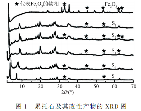 在室溫下,按體積比為 2 ∶ 1 將 Na2CO3 (0. 1 mol·L - 1)溶液滴加到 FeCl3 (0. 1 mol·L - 1)溶液中,攪拌30 min 后陳化 24 h,制得鐵柱撐溶液;在 65 ℃水浴攪拌條件下,將 1 g 累托石( S)分散到裝有柱撐液的燒瓶中反應(yīng) 8 h,靜置后離心,用去離子水洗滌,在 105 ℃下烘干,研磨過 200 目篩后制得羥基鐵柱撐累托石;該柱撐累托石在 500 ℃ 下煅燒 2 h,即制得 Fe2O3 /累托石。 重復(fù)上述步驟,分別加入鐵離子濃度為0. 1 mol·L - 1的柱撐溶液 50、100 和 150 mL,制備的材料依次命名為 S1 、S2 和 S3 ,其中 Fe2O3 /累托石 S2 未經(jīng)煅燒的樣品( S0 )為羥基鐵柱撐累托石。