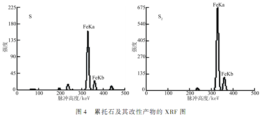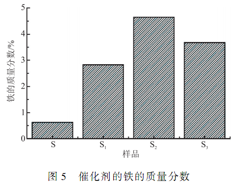圖4 為累托石及其改性產(chǎn)物的 XRF 圖。 如圖4 所示,累托石及其改性累托石的 XRF 圖譜中均存在鐵的譜峰,其中 S2 的 Fe 的 Ka、Kb 峰強(qiáng)度較高分別為 666、133。 XRF 測試結(jié)果表明累托石樣品中含有一定量的鐵元素,但其含量較低;柱撐改性通過羥基鐵與累托石片層間陽離子的置換和累托石對羥基鐵的吸附作用有效增加了累托石的鐵負(fù)載量。 AAS 對鐵含量定量分析(圖 5)的檢測結(jié)果與 XRF 測試結(jié)果一致,合成材料 Fe2O3 /累托石的 Fe 元素含量較累托石的明顯增加,其中S2 的 Fe 元素質(zhì)量分?jǐn)?shù)最高為 4. 65% 。 催化劑中鐵含量的增加會在一定程度上改善催化劑的催化性能。