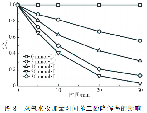 在 S2 投加量為 1. 0 g·L - 1,間苯二酚的初始濃度為 100 mg·L - 1,溫度為 45 ℃,pH 值為 2 的條件下,考察 H2O2 投加量分別為 0、5、10、20 和 30 mmol·L - 1時間苯二酚的降解效果,結(jié)果如圖 8 所示。 增加H2O2 的投加量,間苯二酚的去除率明顯提高;當(dāng) H2O2 的投加量從 20 mmol·L - 1增加到30 mmol·L - 1時間苯二酚的去除效果并沒有明顯的提高,反而有所下降。 這是因為適當(dāng)增加 H2O2 的投加量有利于·OH的生成,促進(jìn)底物降解;當(dāng) H2O2 投加過量時,部分 H2O2 會捕捉·OH,使得體系中·OH 濃度降低,從而降低了 H2O2 的利用率和污染物的處理效果,故本實驗 H2O2 的最佳投加量為20 mmol·L - 1。