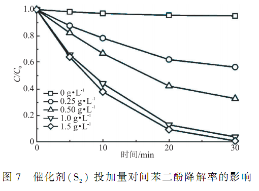 在催化劑投加量為 1. 0 g·L - 1,H2O2 投加量為 20 mmol·L - 1,間苯二酚的初始濃度為 100 mg·L - 1,溫度為 45 ℃,pH 值為 2 的條件下,考察催化劑為 S、S1 、S2 和 S3 時對間苯二酚的催化降解效果,結(jié)果如圖 6 所示。 隨著反應(yīng)的進(jìn)行間苯二酚的濃度逐漸降低,催化劑對底物的去除率按 S、S1 、S3 、S2 順序遞增,催化劑 S1 、S2 和 S3 的質(zhì)量比活性分別為催化劑 S 的 2. 9、4. 1 和 3. 4 倍,可知隨著催化劑中鐵含量的增加催化劑的催化性能逐漸增強(qiáng),其中 S2 催化性能最好,催化降解過程中有較多的反應(yīng)位點,且能釋放較多的鐵離子,從而使得羥基自由基的生成量增加,進(jìn)而促進(jìn)了底物的降解,反應(yīng)結(jié)束時底物的去除率可達(dá) 96. 3% ,故 S2 為最佳催化劑。
