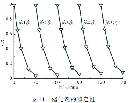 為了進(jìn)一步探究 Fe2O3 /累托石催化降解間苯二酚的穩(wěn)定性,在催化劑投加量為 1. 0 g·L - 1,H2O2 投加量為 20 mmol·L - 1,間苯二酚的初始濃度為 100 mg·L - 1,溫度為 45 ℃,pH 值為 2 的條件下,對 Fe2O3 /累托石 S2 進(jìn)行了 5 次循環(huán)實驗。 由圖 11 可知,經(jīng)過 5 次循環(huán)間苯二酚的去除率并未明顯變化,Fe2O3 /累托石對間苯二酚具有較穩(wěn)定的催化性能,故 Fe2O3 /累托石不失為一種能有效處理水體中難降解有機(jī)污染物的催化材料,同時,對 Fe2O3 /累托石的探究也為金屬柱撐或剝離累托石的進(jìn)一步研究提供了可能。