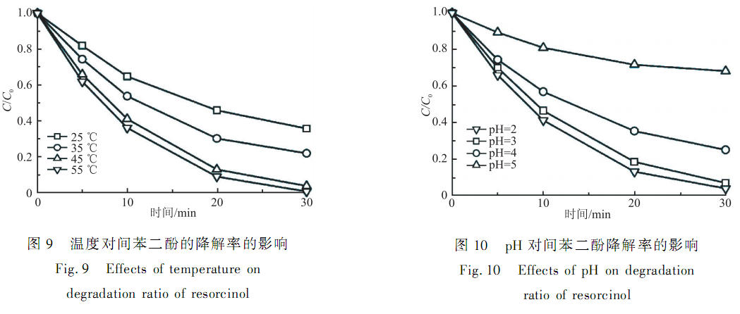 在 S2 投加量為 1. 0 g·L - 1,H2O2 投加量為 20 mmol·L - 1,間苯二酚的初始濃度為 100 mg·L - 1,pH值為 2 的條件下,考察反應(yīng)體系溫度分別為 25、35、45 和 55 ℃時對降解反應(yīng)的影響。 如圖 9 所示,間苯二酚的去除率隨著反應(yīng)體系溫度的升高逐漸增加,但當(dāng)溫度從 45 ℃升高到 55 ℃時底物的去除效果并未明顯變化,只是略有增加;考慮到實際應(yīng)用中提升溫度會增加能耗,提高處理成本,不夠經(jīng)濟(jì),故本實驗選擇45 ℃為最佳反應(yīng)溫度。