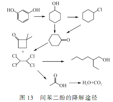 根據(jù)檢測到的產(chǎn)物,結(jié)合苯系取代物的降解過程,對間苯二酚的降解過程進(jìn)行推斷,可能的反應(yīng)途徑如圖 13 所示,間苯二酚最終被氧化分解成小分子有機(jī)物或 H2O 和 CO2 ,達(dá)到了有效去除水體中難降解有機(jī)污染物的目的。具體參見污水寶商城資料或http://wlmqsb.com更多相關(guān)技術(shù)文檔。