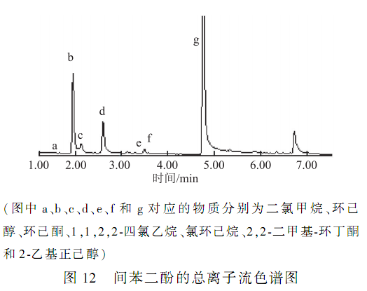 通過 GC-MS 對間苯二酚的降解產(chǎn)物進(jìn)行檢測,利用質(zhì)譜標(biāo)準(zhǔn)圖庫對所檢測到的色譜峰進(jìn)行定性分析,結(jié)果如圖 12 所示。