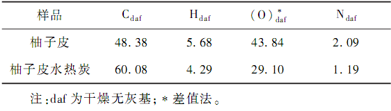 柚子皮及柚子皮水熱炭的元素分析如表 1 所示。 在水熱炭化的過程中,柚子皮經(jīng)過脫水、脫羧、聚合等反應(yīng)后形成水熱炭,其固炭率提高,由原來的48. 38%上升至 60. 08% ;相反,氫、氮、氧元素含量有所下降,分別由原來的 5. 68% 、2. 09% 、43. 84%下降至 4. 29% 、1. 19% 、29. 10% ,但也保留了原料中大部分的氮氧元素,可以在表面形成豐富的含氧官能團(tuán)。