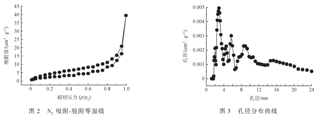 柚子皮水熱炭的 N2 吸附-脫附等溫曲線如圖 2 所示。 可知,在低壓區(qū)(0 ~ 0. 1)水熱炭的氮吸附量變化較小,隨著相對壓力的繼續(xù)增加,氮吸附量緩慢增加,屬 IV 型曲線;相對壓力在 0. 1 ~ 0. 9 之間,可以 看到明顯的吸脫附滯后環(huán),表明有大量的中孔存在。 柚子皮水熱炭的孔徑分布曲線如圖 3 所示。 氮吸附結(jié)果表明,柚子皮經(jīng)水熱炭化后的比表面積和總孔容分別為 79 m2·g- 1和 0. 362 cm3·g- 1 ,孔徑分布較寬,主要在 2 ~ 24 nm 之間,是典型的介孔材料。 較多的中孔可以為離子提供擴(kuò)散通道,減小離子的擴(kuò)散阻力,加速擴(kuò)散的過程,從而達(dá)到很好的吸附效果。