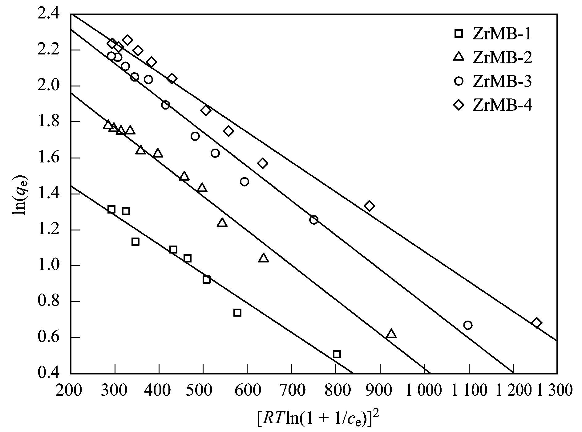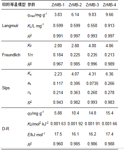 式中, qe為吸附劑對(duì)水中吸附質(zhì)的單位吸附量(mg·g-1); ce為平衡時(shí)刻水中吸附質(zhì)的濃度(mg·L-1); qmax為吸附劑對(duì)水中吸附質(zhì)的最大單層單位吸附量(mg·g-1); KL為L(zhǎng)angmuir吸附常數(shù)(L·mg-1); KF和1/n均為Freundlich吸附常數(shù).采用公式(6) 和(7) 對(duì)圖 4實(shí)驗(yàn)數(shù)據(jù)進(jìn)行擬合, 結(jié)果見表 3.根據(jù)計(jì)算得到的等溫吸附模型參數(shù), 計(jì)算得到qe對(duì)ce曲線, 結(jié)果亦見圖 4.由表 3和圖 4可見, Langmuir和Freundich等溫吸附模型均可以用于擬合不同鋯負(fù)載量鋯改性膨潤(rùn)土對(duì)水中磷酸鹽的吸附平衡實(shí)驗(yàn)數(shù)據(jù).根據(jù)Langmuir模型, ZrMB-1、ZrMB-2、ZrMB-3和ZrMB-4這4種鋯改性膨潤(rùn)土對(duì)水中磷酸鹽的最大單層單位吸附量(以P計(jì))分別被預(yù)測(cè)為3.83、6.14、9.03和9.66 mg·g-1.顯然, 鋯改性膨潤(rùn)土對(duì)水中磷酸鹽的最大單層單位吸附量隨著鋯負(fù)載量的增加而增加, 并且當(dāng)ZrO2負(fù)載量由3.61%增加13.15%時(shí)鋯改性膨潤(rùn)土的最大單層單位吸附量顯著增加, 而繼續(xù)增加鋯負(fù)載量時(shí)鋯改性膨潤(rùn)土的最大單層單位吸附量則緩慢提高. Freundlich模型的參數(shù)KF與吸附容量直接相關(guān), 通常KF越大, 吸附容量越高.本文計(jì)算得到的KF值的排序?yàn)椋篫rMB-1 考慮到Langmuir和Freundlich等溫吸附模型均可以用于擬合本文的實(shí)驗(yàn)數(shù)據(jù), 因此通過這2個(gè)模型很難確定鋯改性膨潤(rùn)土和磷酸鹽之間相互作用的類型.為此, 本文進(jìn)一步采用Sips等溫吸附模型對(duì)圖 4實(shí)驗(yàn)數(shù)據(jù)進(jìn)行擬合. Sips模型是Langmuir和Freundlich模型的組合.當(dāng)水中吸附質(zhì)濃度較高時(shí), Sips模型可以像Langmuir模型那樣預(yù)測(cè)最大單層單位吸附量; 當(dāng)水中吸附質(zhì)濃度較低時(shí), Sips模型可以像Freundlich模型那樣描述吸附劑對(duì)水中較低濃度吸附質(zhì)的吸附行為. Sips等溫吸附模型的數(shù)學(xué)表達(dá)式見公式(8) . 式中, qe(mg·g-1)和ce(mg·L-1)分別為吸附劑對(duì)水中吸附質(zhì)的平衡單位吸附量和平衡時(shí)刻水中吸附質(zhì)的質(zhì)量濃度; Ks、as和ns均為Sips等溫吸附模型參數(shù). ns可以用來表征吸附劑表面的不均勻性; 如果ns小于1, 則吸附劑表面的吸附位是不均勻的, 并且ns越小, 吸附劑表面越不均勻; 如果ns接近或等于1, 則吸附劑表面的吸附位是均勻的.采用公式(8) 對(duì)圖 4實(shí)驗(yàn)數(shù)據(jù)進(jìn)行擬合, 擬合結(jié)果見表 3.根據(jù)計(jì)算得到的等溫吸附模型參數(shù)計(jì)算得到qe對(duì)ce曲線, 結(jié)果亦見圖 4.由表 3和圖 4可見, Sips等溫吸附模型可以用于描述鋯改性膨潤(rùn)土對(duì)水中磷酸鹽吸附等溫實(shí)驗(yàn)數(shù)據(jù).這說明當(dāng)水中磷酸鹽濃度較低時(shí), Freundlich模型與Langmuir模型相比更適合用于描述鋯改性膨潤(rùn)土對(duì)磷酸鹽的吸附行為; 當(dāng)水中磷酸鹽濃度較高時(shí), 單層吸附是鋯改性膨潤(rùn)土吸附磷酸鹽的主要模式.本文計(jì)算得到的ns均小于1, 說明ZrMB-1、ZrMB-2、ZrMB-3和ZrMB-4這4種鋯改性膨潤(rùn)土表面的吸附位分布是不均勻的. Langmuir、Freundlich和Sips等溫吸附模型不能識(shí)別吸附的類型, 即物理吸附或化學(xué)吸附, 而D-R等溫吸附模型則可以用來識(shí)別吸附反應(yīng)的類型.線性化D-R等溫吸附模型的數(shù)學(xué)表達(dá)式為: 式中, qe和qD分別為吸附劑對(duì)水中吸附質(zhì)的平衡單位吸附量和最大單位吸附量(mg·g-1); ce為水中吸附質(zhì)的平衡質(zhì)量濃度(mol·L-1); R為理想氣體常數(shù)[8.314 J·(mol·K)-1]; T為反應(yīng)溫度(K); KD為D-R等溫吸附模型常數(shù)(mol2·kJ-2). KD被進(jìn)一步用來計(jì)算平均吸附自由能(E, kJ·mol-1), 它的計(jì)算公式為: 通常情況下, 物理吸附的E值小于8 kJ·mol-1, 而化學(xué)吸附的E值則大于8 kJ·mol-1[39].公式(9) 對(duì)圖 4實(shí)驗(yàn)數(shù)據(jù)的擬合曲線見圖 5, 根據(jù)圖 5計(jì)算得到的D-R等溫吸附模型參數(shù)見表 3.由圖 5和表 3可見, D-R等溫吸附模型可以用于擬合鋯改性膨潤(rùn)土對(duì)水中磷酸鹽的吸附平衡實(shí)驗(yàn)數(shù)據(jù).由表 3可見, 計(jì)算得到的E值均大于8 kJ·mol-1, 這說明不同鋯負(fù)載量的鋯改性膨潤(rùn)土對(duì)水中磷酸鹽的吸附均屬于化學(xué)吸附.這與根據(jù)吸附動(dòng)力學(xué)研究所得到的結(jié)論是一致的. 圖 5 D-R等溫吸附模型擬合曲線 表 3 等溫吸附模型對(duì)鋯改性膨潤(rùn)土吸附水中磷酸鹽吸附等溫線的擬合結(jié)果 表 4為先前研究報(bào)道過的基于水合氧化鋯吸附劑和本文報(bào)道的鋯改性膨潤(rùn)土的最大磷單位吸附量.從中可以看出, ZrMB-3和ZrMB-4這2種鋯改性膨潤(rùn)土的最大磷酸鹽單位吸附量大于水合氧化鋯負(fù)載陰離子交換樹脂、水合氧化鋯負(fù)載木質(zhì)纖維素丁醇?xì)堅(jiān)、鋯改性沸石和鋯改性高嶺土等基于水合氧化鋯吸附劑的最大單位吸附量, 這說明ZrMB-3和ZrMB-4這2種鋯改性膨潤(rùn)土屬于磷酸鹽吸附容量較高的基于水合氧化鋯的吸附劑.對(duì)比分析ZrMB-3和ZrMB-4可以發(fā)現(xiàn), 雖然ZrMB-4的ZrO2(19.63%)明顯高于ZrMB-3的ZrO2(13.15%), 可是ZrMB-4的磷酸鹽最大單位吸附量?jī)H僅比ZrMB-3多7%左右.因此, 綜合考慮吸附劑的經(jīng)濟(jì)成本和吸附容