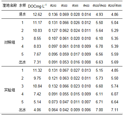 兩組濕地沿程溶解性有機(jī)物(DOC)及其光譜特征如表 3所示(10月12日測(cè)定結(jié)果).總體來看, DOC及各波長(zhǎng)的吸光度沿程下降, 且對(duì)照組各采樣點(diǎn)高于實(shí)驗(yàn)組.實(shí)驗(yàn)組采樣點(diǎn)3的DOC明顯升高, 可能是經(jīng)過第一礫石基質(zhì)層(鐵炭層)后, 尾水中部分不溶性有機(jī)物轉(zhuǎn)變成了可溶性有機(jī)物. a300/a400可表征污水腐殖度和芳香度, 該比值越大, 說明尾水中腐殖度和芳香度越小, 其難降解污染物含量越少.兩組濕地出水中a300/a400均大于進(jìn)水, 表明經(jīng)過人工濕地的處理, 尾水的腐殖度和芳香度均有所下降.濕地中腐殖度和芳香度高的物質(zhì)難以被微生物降解, 實(shí)驗(yàn)組各采樣點(diǎn)a300/a400大于對(duì)照組, 表明鐵炭?jī)?nèi)電解可降低尾水的腐殖度和芳香度. a250/a365可作為水中溶解性有機(jī)物分子質(zhì)量大小的評(píng)價(jià)指標(biāo), 該比值越大, 尾水中有機(jī)物平均分子質(zhì)量越小. 表 3中a250/a365總體上沿程降低, 表明污水中有機(jī)物分子質(zhì)量逐漸下降, 且實(shí)驗(yàn)組a250/a365高于對(duì)照組, 說明實(shí)驗(yàn)組污水中大分子有機(jī)物向小分子轉(zhuǎn)化更為徹底.對(duì)照組a250/a365沿程均勻下降, 而實(shí)驗(yàn)組經(jīng)過鐵炭層(取樣點(diǎn)1~3) 后, a250/a365顯著升高, 表明鐵炭層是大分子有機(jī)物向小分子轉(zhuǎn)化的主要單元.