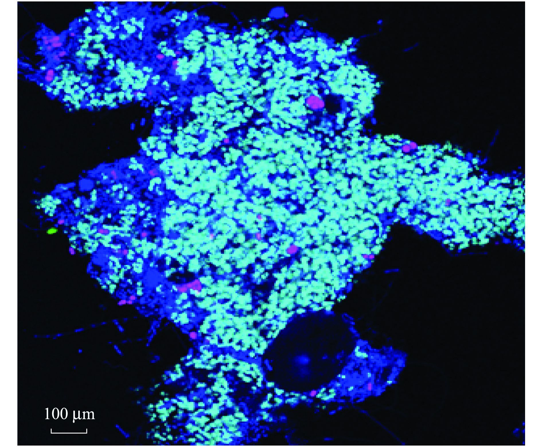 樣品預(yù)處理:取好氧末污泥混合液離去上清液, 加入1 mL的1×PBS緩沖溶液重懸, 重復(fù)操作兩次后, 加入1 mL的4%的多聚甲醛溶液重懸, 置于4℃條件下固定2 h, 然后離去上清液, 加入1×PBS緩沖溶液離心, 重復(fù)3次, 以洗去多余的多聚甲醛溶液, 分別加入0.5 mL的1×PBS緩沖溶液和無(wú)水乙醇, 搖勻置于-20℃下保存.