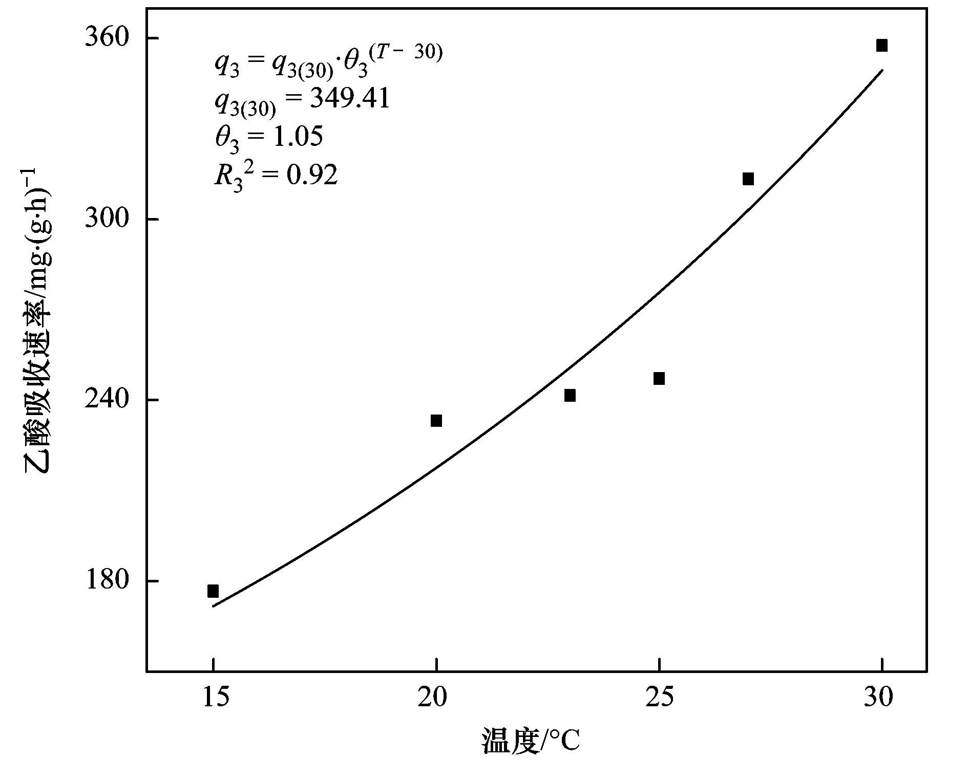 在15~30℃溫度范圍內(nèi), PAOHT對(duì)乙酸的最大吸收速率分別為176.70、233.14、241.59、247.22、313.37、357.47 mg·(g·h)-1, 乙酸的最大吸收速率隨溫度的升高而增大.該試驗(yàn)結(jié)果與Brdjanovic等關(guān)于溫度對(duì)最大乙酸利用速率的影響所得出的結(jié)論有所不同, 其認(rèn)為當(dāng)溫度超過20℃時(shí), PAO和GAO對(duì)乙酸的最大吸收速率不再隨溫度變化, 其值為常數(shù), 并且Lopez-Vazquez等研究表明當(dāng)溫度為30℃時(shí), PAO在厭氧狀態(tài)下對(duì)乙酸的最大吸收速率為0.20 mol·(mol·h)-1, 而本研究的PAOHT在厭氧狀態(tài)下對(duì)乙酸的最大吸收速率為0.357 g·(g·h)-1, 其中VSS(以C5H7NO2計(jì))的摩爾質(zhì)量為113 g·mol-1, 對(duì)應(yīng)的碳摩爾質(zhì)量為22.6 g·mol-1, 同理可得乙酸的摩爾質(zhì)量為30 g·mol-1, 則對(duì)應(yīng)的以碳摩爾質(zhì)量計(jì)量的最大乙酸利用速率為0.269 mol·(mol·h)-1, 結(jié)果高于Lopez-Vazquez等得出的數(shù)據(jù), 這也就說(shuō)明了本系統(tǒng)培養(yǎng)的PAOHT對(duì)乙酸具有較高的吸收和競(jìng)爭(zhēng)能力.