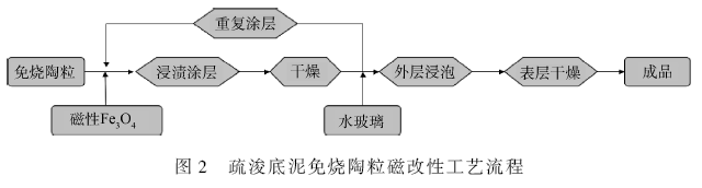 圖2 是免燒陶粒磁改性工藝流程圖。目前此類濾料的表面改性的方法主要是沉淀法和高溫加熱二次灼燒法2 種。本工藝在沉淀法的基礎(chǔ)上,利用水玻璃浸泡,使陶粒表層的Fe3 O4 與陶粒表層粘合更牢固。