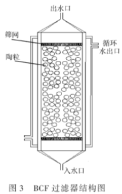 BCF 中填入直徑為22 mm 的鐵石篩網(wǎng)作為承托層。鐵石篩網(wǎng)分布于裝置的入水及出水口55 mm處,陶粒填料層高為210 mm。篩網(wǎng)不僅可以作為承托層來防止陶粒由于水流沖刷堵塞入水及出水口,還能夠?qū)λ鬟M(jìn)行分流,與陶粒接觸均勻,使掛膜更完全。BCF 過濾器如圖3 所示。