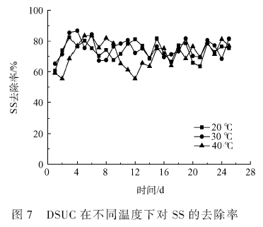 圖7 是DSUC 在不同溫度下SS 的去除情況?梢钥闯,陶粒對(duì)SS 的去除效果受溫度影響較小,SS去除率由第1 天的60% 左右在第3 天上升至80% 左右,且SS 去除率穩(wěn)定在60% ~ 90% 之間。在第22天左右時(shí),SS 去除率的波動(dòng)幅度減小,穩(wěn)定在78%左右。陶粒對(duì)SS 的去除主要有2 個(gè)原因: 一是DSUC 表面粗糙,孔徑大小不一,表面凹凸,能夠截留污水中的懸浮物[20] ,在初期達(dá)到去除SS 的效果;二是隨著實(shí)驗(yàn)的進(jìn)行,陶粒表面微生物膜成熟,對(duì)懸浮物有很好的吸附作用,吸附的部分SS 被微生物利用,達(dá)到了生物除SS 的效果。
