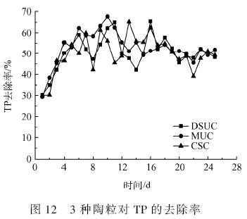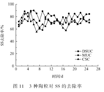 圖11 是3 種陶粒對(duì)SS 的去除效果?梢钥闯,MUC 對(duì)SS 去除效果優(yōu)于DSUC 和CSC,在第6 天對(duì)SS 達(dá)到最大去除率90. 1% ,而DSUC 在第4 天達(dá)到86. 3% ,CSC 在第5 天達(dá)到88. 2% ,這是因?yàn)镸UC表面呈弱磁性,不僅粗糙的表面能夠截留大量懸浮物,且弱磁性改變陶粒周圍水流磁場(chǎng),增強(qiáng)對(duì)懸浮物的吸附,提高SS 去除率。濾料對(duì)SS 達(dá)到最大去除率后至22 d 之間,MUC 對(duì)SS 去除效果明顯優(yōu)于另兩者,去除率曲線呈上下波動(dòng)。第22 天左右,陶粒對(duì)SS 去除率趨于穩(wěn)定,MUC 穩(wěn)定在84% 左右,DSUC和CSC 分別穩(wěn)定在75% 和74% 左右,疏浚底泥免燒陶粒對(duì)SS 的去除效果與商品燒結(jié)陶粒相近,而MUC較DSUC 提高了9% 。
