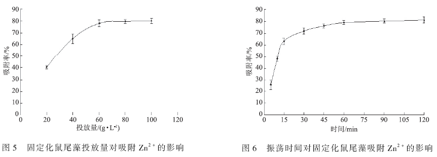 由圖6 可以看出:隨著時間的增加,吸附率的變化先快后慢,變化明顯。30 min 內(nèi)由25. 6% 迅速提高到72. 1% ;在60 min 后吸附變化趨于平衡,120 min 時達(dá)到最大吸附率為81. 3% 。鼠尾藻粉吸附重金屬分為2 個過程:快速吸附過程與緩慢吸附過程,前期由于官能團(tuán)裸露在表面,重金屬離子快速與官能團(tuán)進(jìn)行吸附作用,而緩慢吸附階段主要官能團(tuán)表面大部分已被Zn2 + 占據(jù),并與游離的Zn2 + 產(chǎn)生排斥作用,從而降低吸附速率。固定化顆粒吸附重金屬離子的過程主要是快速吸附過程,在較短的時間內(nèi)快速達(dá)到吸附平衡。